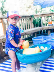 First and foremost, if your little one is 6 months or younger, the use of sunscreen is not suggested. Specialists suggest keeping them well covered with UV protective gear, like rash guard shirts and sun hats and to in shady areas instead (of course, rash guards like Beau and Belle Littles swim shirts are available for kids up to 5T and offer UPF 50 protection). Also keep in mind that babies are still working on their internal cooling systems, so they don’t sweat like you or I. Therefore they do not cool down well when in the sun. Please be extra safe when taking a baby 6 months old or younger outside in the heat and sun.